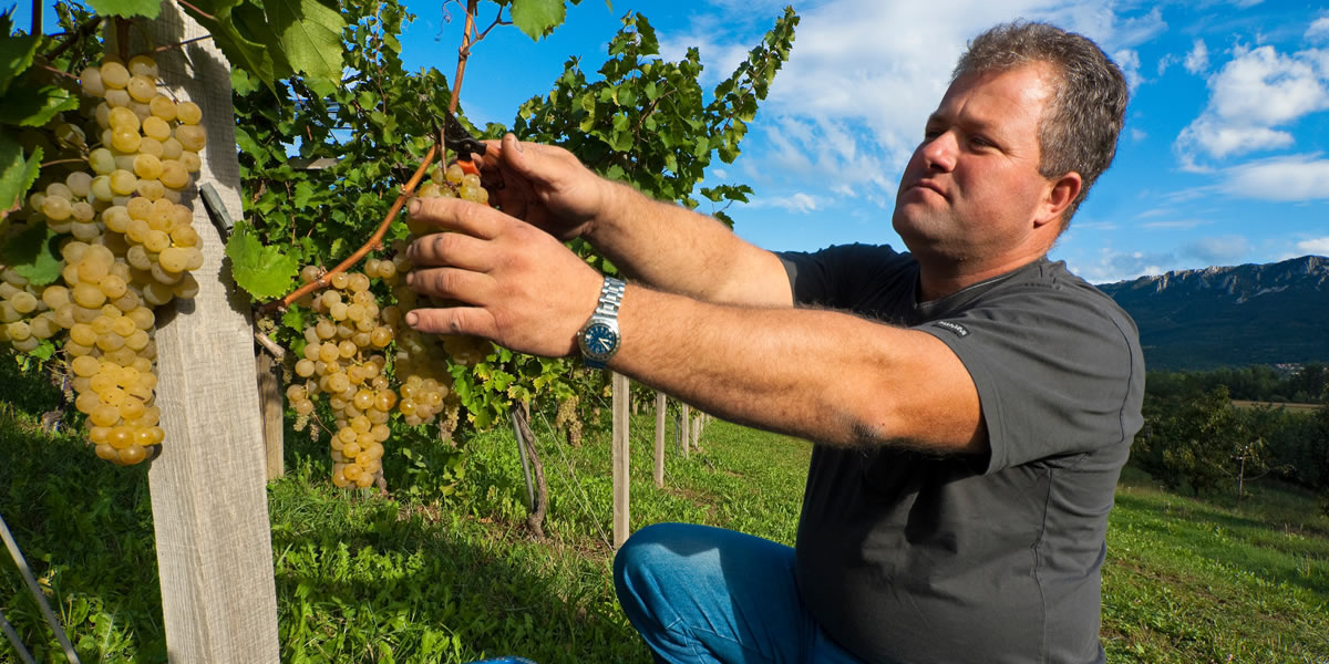 Quality wine begins with healthy grapes Our grapes are grown with great effort, patience and love, through many hours of manual and machine labour in the vineyard. We’ve dedicated 10 hectares of land to the vine, which thrives splendidly in the marl soil of these parts. In the heart of our vineyards lies the great wine cellar with it tasting room, furnished in the style of the traditional old Vipava Valley wine cellars. Besides grapes intended for wine production, our soil grows 9 varieties of tasty table grapes as well. We also cultivate grafted vines, which allows us to supply our vineyards with vines of the highest quality. We like to connect with other local winemakers, educating one another and striving together for the visibility of our precious indigenous varieties – Zelen and Pinela. We take pride in the accolades we’ve received for our wines, and the tidy sights of our vineyards. Most of all, though, we care for your satisfaction – that of our buyers.